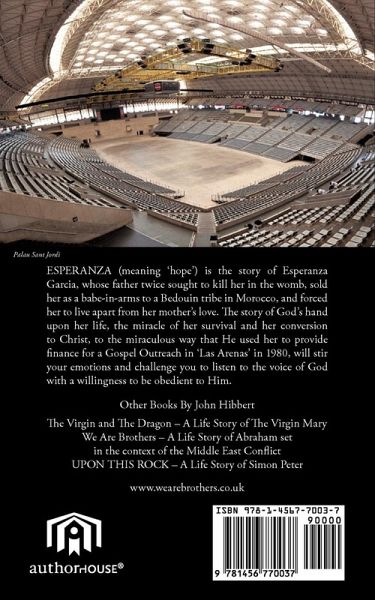 ESPERANZA (meaning 'hope') is the story of Esperanza Carrizosa Garcia, whose father twice sought to kill her in the womb, sold her as a babe-in-arms to a Bedouin tribe in Morocco, and forced her to live apart from her mother's love. The story of God's hand upon her life, the miracle of her survival and her conversion to Christ, to the miraculous way that He used her to provide finance for the crusade in 'Las Arenas' in 1980, will stir your emotions and challenge you to listen to the voice of God with a willingness to be obey Him.