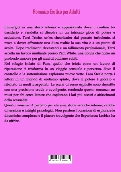 Immergiti in una storia intensa e appassionata dove il confine tra desiderio e vendetta si dissolve in un intricato gioco di potere e seduzione. Terri Triche, un'ex cheerleader dal passato turbolento, si trova a dover affrontare una dura realtà: la sua vita è a un punto di svolta. Dopo tradimenti devastanti e un fallimento professionale, Terri accetta un lavoro umiliante presso Pam White, una donna che nutre un profondo rancore per gli anni di bullismo subiti.Nel rifugio isolato di Pam, quello che inizia come un lavoro di riparazione si trasforma in un viaggio sensuale e perverso, dove il controllo e la sottomissione esplorano nuove vette. Lara Steele porta i lettori in un mondo di erotismo spinto, dove il potere è giocato e ribaltato in modi inaspettati. Le scene di sesso esplicito sono descritte con una precisione cruda e avvolgente, rendendo questo romanzo un must per chi cerca letture che esplorano i lati più oscuri e affascinanti della sessualità.Questo romanzo è perfetto per chi ama storie erotiche intense, cariche di tensione e intrighi psicologici. Non perdere l'occasione di esplorare le dinamiche complesse e il piacere travolgente che Esperienza Lesbica ha da offrire.