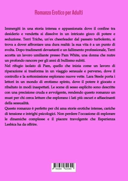 Immergiti in una storia intensa e appassionata dove il confine tra desiderio e vendetta si dissolve in un intricato gioco di potere e seduzione. Terri Triche, un'ex cheerleader dal passato turbolento, si trova a dover affrontare una dura realtà: la sua vita è a un punto di svolta. Dopo tradimenti devastanti e un fallimento professionale, Terri accetta un lavoro umiliante presso Pam White, una donna che nutre un profondo rancore per gli anni di bullismo subiti.Nel rifugio isolato di Pam, quello che inizia come un lavoro di riparazione si trasforma in un viaggio sensuale e perverso, dove il controllo e la sottomissione esplorano nuove vette. Lara Steele porta i lettori in un mondo di erotismo spinto, dove il potere è giocato e ribaltato in modi inaspettati. Le scene di sesso esplicito sono descritte con una precisione cruda e avvolgente, rendendo questo romanzo un must per chi cerca letture che esplorano i lati più oscuri e affascinanti della sessualità.Questo romanzo è perfetto per chi ama storie erotiche intense, cariche di tensione e intrighi psicologici. Non perdere l'occasione di esplorare le dinamiche complesse e il piacere travolgente che Esperienza Lesbica ha da offrire.
