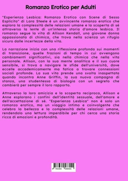 "Esperienza Lesbica: Romanzo Erotico con Scene di Sesso Esplicito" di Lara Steele è un avvincente romanzo erotico che esplora la complessità delle relazioni umane e la scoperta di sé attraverso la lente di un'intensa storia d'amore lesbica. Il romanzo segue la vita di Allison Kendall, una giovane donna appassionata di chimica, che trova nella scienza un rifugio sicuro dalle incertezze della vita. La narrazione inizia con una riflessione profonda sui momenti di transizione, quelle frazioni di tempo in cui avvengono cambiamenti significativi, sia nella chimica che nella vita personale. Allison, con la sua mente analitica e il suo cuore sensibile, si trova a navigare le sfide dell'università, dove eccelle accademicamente ma fatica a trovare connessioni sociali profonde. La sua vita prende una svolta inaspettata quando incontra Anne Griffin, la sua nuova compagna di stanza, una studentessa di biologia con un segreto che cambierà per sempre il loro rapporto. Attraverso la loro amicizia e la scoperta reciproca, Allison e Anne esplorano i confini dell'identità sessuale, dell'amore e dell'accettazione di sé. "Esperienza Lesbica" non è solo un romanzo erotico, ma un viaggio intimo e coinvolgente che celebra la bellezza e la complessità delle relazioni umane, rendendolo una lettura imperdibile per chi cerca una storia ricca di emozioni e profondità.