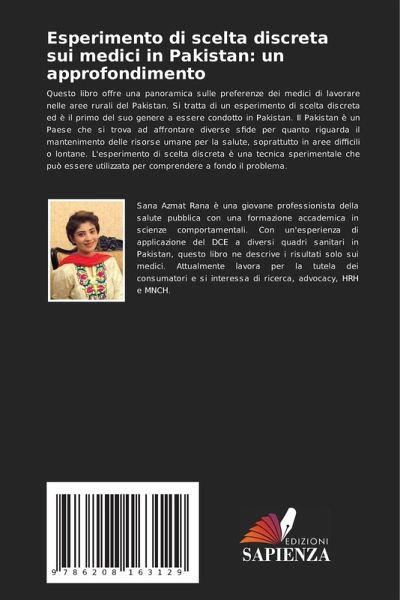 Questo libro offre una panoramica sulle preferenze dei medici di lavorare nelle aree rurali del Pakistan. Si tratta di un esperimento di scelta discreta ed è il primo del suo genere a essere condotto in Pakistan. Il Pakistan è un Paese che si trova ad affrontare diverse sfide per quanto riguarda il mantenimento delle risorse umane per la salute, soprattutto in aree difficili o lontane. L'esperimento di scelta discreta è una tecnica sperimentale che può essere utilizzata per comprendere a fondo il problema.