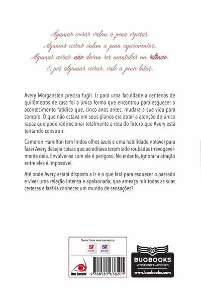 Algumas coisas valem a pena esperar. Algumas coisas valem a pena experimentar. Algumas coisas não devem ser mantidas em silêncio. E, por algumas coisas, vale a pena lutar. Avery Morgansten precisa fugir. Ir para uma faculdade a centenas de quilômetros de casa foi a única forma que encontrou para esquecer o acontecimento fatídico que, cinco anos antes, mudara a sua vida para sempre. O que não estava em seus planos era atrair a atenção do único rapaz que pode mudar totalmente a rota do futuro que Avery está tentando construir. Cameron Hamilton tem um metro e noventa de altura, impressionantes olhos azuis e uma habilidade notável para fazer com que Avery deseje coisas que ela acreditava terem sido roubadas irrevogavelmente dela. Envolver-se com ele é perigoso. No entanto, ignorar a tensão entre eles - e despertar um lado dela que nunca soube que existia - é impossível. Até onde ela estará disposta a ir e o que fará para esquecer o passado e viver aquela relação intensa e apaixonada, que ameaça ruir todas as suas certezas e fazê-la conhecer um mundo de sensações que julgava estar negadas para sempre?