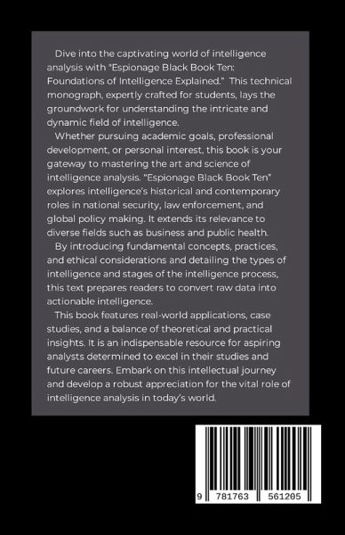 Dive into the captivating world of intelligence analysis with "Espionage Black Book Ten: Foundations of Intelligence Explained." This technical monograph, expertly crafted for students, lays the groundwork for understanding the intricate and dynamic field of intelligence. Whether pursuing academic goals, professional development, or personal interest, this book is your gateway to mastering the art and science of intelligence analysis. "Espionage Black Book Ten" explores intelligence's historical and contemporary roles in national security, law enforcement, and global policymaking. It extends its relevance to diverse fields such as business and public health. By introducing fundamental concepts, practices, and ethical considerations and detailing the types of intelligence and stages of the intelligence process, this text prepares readers to convert raw data into actionable intelligence. This book features real-world applications, case studies, and a balance of theoretical and practical insights. It is an indispensable resource for aspiring analysts determined to excel in their studies and future careers. Embark on this intellectual journey and develop a robust appreciation for the vital role of intelligence analysis in today's world.