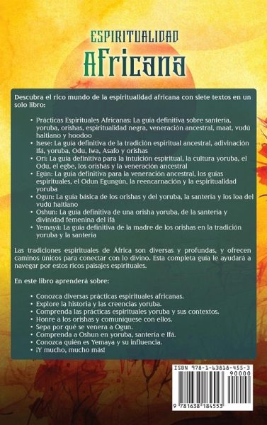 Descubra el rico mundo de la espiritualidad africana con siete textos en un solo libro: Prácticas Espirituales Africanas: La guía definitiva sobre santería, yoruba, orishas, espiritualidad negra, veneración ancestral, maat, vudú haitiano y hoodoo Isese: La guía definitiva de la tradición espiritual ancestral, adivinación Ifá, yoruba, Odu, Iwa, Asafo y orishas Orí: La guía definitiva para la intuición espiritual, la cultura yoruba, el Odu, el egbe, los orishás y la veneración ancestral Egún: La guía definitiva para la veneración ancestral, los guías espirituales, el Odun Egungún, la reencarnación y la espiritualidad yoruba Ogun: La guía básica de los orishas y del yoruba, la santería y los loa del vudú haitiano Oshun: La guía definitiva de una orisha yoruba, de la santería y divinidad femenina del ifá Yemayá: La guía definitiva de la madre de los orishas en la tradición yoruba y la santería Con la primera parte:Conozca diversas prácticas espirituales africanas. Explore los dioses creadores y las deidades. Con la segunda parte:Explore la historia y las creencias yoruba. Aprenda sobre Olodumare, el ser supremo. Con la tercera parte:Comprenda las prácticas espirituales yoruba y sus contextos. Explore su Ori a través de mitos y tradiciones. Con la cuarta parte:Comprenda las prácticas espirituales yoruba. Honre a los orishas y comuníquese con ellos. En quinto lugar, descubra a Ogun y su culto:Sepa por qué se venera a Ogun. Explore los mitos y leyendas de Ogun. Sexto, conecte con Oshun, la divinidad femenina:Comprenda a Oshun en yoruba, santería e Ifá. Determine si Oshun es su progenitora yoruba. Por último, abrace la compasión de Yemaya en la séptima parte:Conozca quién es Yemaya y su influencia. Explore los mitos y leyendas de Yemaya.