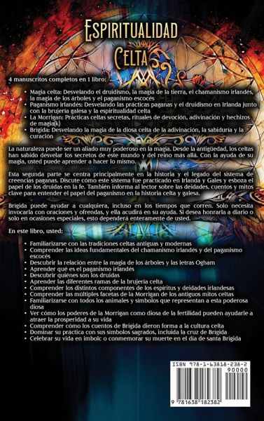 4 manuscritos completos en 1 libro:Magia celta: Desvelando el druidismo, la magia de la tierra, el chamanismo irlandés, la magia de los árboles y el paganismo escocés Paganismo irlandés: Desvelando las prácticas paganas y el druidismo en Irlanda junto con la brujería galesa y la espiritualidad celta La Morrigan: Prácticas celtas secretas, rituales de devoción, adivinación y hechizos de magia(k) Brígida: Desvelando la magia de la diosa celta de la adivinación, la sabiduría y la curación La naturaleza puede ser un aliado muy poderoso en la magia. Desde la antigüedad, los celtas han sabido desvelar los secretos de este mundo y del reino más allá. Con la ayuda de su magia, usted puede aprender a hacer lo mismo. Esta segunda parte se centra principalmente en la historia y el legado del sistema de creencias paganas. Discute cómo este sistema fue practicado en Irlanda y Gales y esboza el papel de los druidas en la fe. También informa al lector sobre las deidades, cuentos y mitos clave para entender el papel del paganismo en la historia celta y galesa. Brígida puede ayudar a cualquiera, incluso en los tiempos que corren. Solo necesita invocarla con oraciones y ofrendas, y ella acudirá en su ayuda. Si desea honrarla a diario o solo en ocasiones especiales, esto dependerá enteramente de usted. En este libro, usted:Familiarizarse con las tradiciones celtas antiguas y modernas Comprender las ideas fundamentales del chamanismo irlandés y del paganismo escocés Descubrir la relación entre la magia de los árboles y las letras Ogham Aprender qué es el paganismo irlandés Descubrir quiénes son los druidas Aprender las diferentes ramas de la brujería celta Comprender los distintos componentes de los espíritus y deidades irlandesas Comprender las múltiples facetas de la Morrigan de los antiguos mitos celtas Familiarizarse con todos los animales y símbolos que representan a esta poderosa diosa Ver cómo los poderes de la Morrigan como diosa de la fertilidad pueden ayudarle a atraer la prosperidad a su vida Comprender cómo los cuentos de Brígida dieron forma a la cultura celta Dominar su práctica con sus símbolos sagrados, incluida la cruz de Brígida Celebrar su vida en imbolc o conmemorar su muerte en el día de santa Brígida