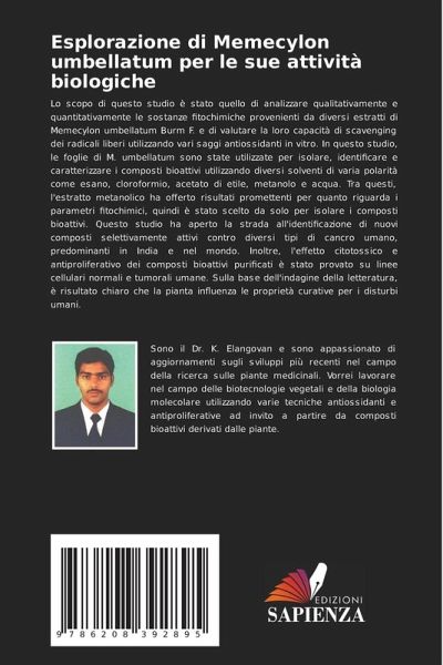 Lo scopo di questo studio è stato quello di analizzare qualitativamente e quantitativamente le sostanze fitochimiche provenienti da diversi estratti di Memecylon umbellatum Burm F. e di valutare la loro capacità di scavenging dei radicali liberi utilizzando vari saggi antiossidanti in vitro. In questo studio, le foglie di M. umbellatum sono state utilizzate per isolare, identificare e caratterizzare i composti bioattivi utilizzando diversi solventi di varia polarità come esano, cloroformio, acetato di etile, metanolo e acqua. Tra questi, l'estratto metanolico ha offerto risultati promettenti per quanto riguarda i parametri fitochimici, quindi è stato scelto da solo per isolare i composti bioattivi. Questo studio ha aperto la strada all'identificazione di nuovi composti selettivamente attivi contro diversi tipi di cancro umano, predominanti in India e nel mondo. Inoltre, l'effetto citotossico e antiproliferativo dei composti bioattivi purificati è stato provato su linee cellulari normali e tumorali umane. Sulla base dell'indagine della letteratura, è risultato chiaro che la pianta influenza le proprietà curative per i disturbi umani.