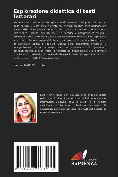 Anche il lavoro sul campo con gli studenti rimane uno dei principali obiettivi della ricerca. Questo libro, animato dall'energia creativa della pedagogista Salma AFIFI, si propone di analizzare la complessità dei testi letterari e di evidenziare i metodi didattici che ci aiuteranno a comprendere meglio i fondamenti della letteratura e delle sue rappresentazioni culturali. Ogni testo letterario ha la sua temporalità, le sue motivazioni, il suo impatto in termini di significato, spirito e registro. Questo libro, riccamente illustrato, è innegabilmente utile per la comprensione, la trasmissione e l'insegnamento dei testi letterari e della critica, all'insegna del motto umanistico "servire e condividere". L'obiettivo è quello di elevare il livello di appropriazione dei testi letterari in tutte le loro dimensioni.Hassan BAKHSISS, scrittore