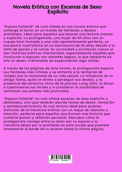 "Esposa Caliente" de Lara Steele es una novela erótica que sumerge al lector en un mundo de fantasías y deseos prohibidos, ideal para aquellos que buscan una lectura intensa y explícita. La protagonista, una mujer de 40 años con un cuerpo bien formado y una vida aparentemente perfecta, se encuentra insatisfecha en su matrimonio de 20 años debido a la falta de pasión y la rutina. Su curiosidad y excitación crecen al leer historias eróticas interraciales, especialmente aquellas que involucran a esposas con amantes negros, lo que despierta en ella un deseo irrefrenable de experimentar algo similar.A través de las páginas de esta novela, la protagonista explora sus fantasías más íntimas y se enfrenta a la tentación de romper con la monotonía de su vida sexual. La influencia de su amiga Tasha, quien le anima a perseguir sus deseos, y la presencia del atractivo chico de la piscina, Long John, la llevan a cuestionarse sus límites y a considerar la posibilidad de satisfacer sus anhelos más profundos."Esposa Caliente" no solo ofrece escenas de sexo explícito y detalladas, sino que también aborda temas de deseo, tentación y autodescubrimiento. Es una lectura ideal para quienes disfrutan de la literatura erótica con un toque de realismo y emoción, perfecta para aquellos que buscan una historia que combine pasión y reflexión personal. Descubre cómo la protagonista navega entre su amor por su esposo y su creciente deseo por lo prohibido en esta novela que promete mantenerte al borde de tu asiento hasta la última página.