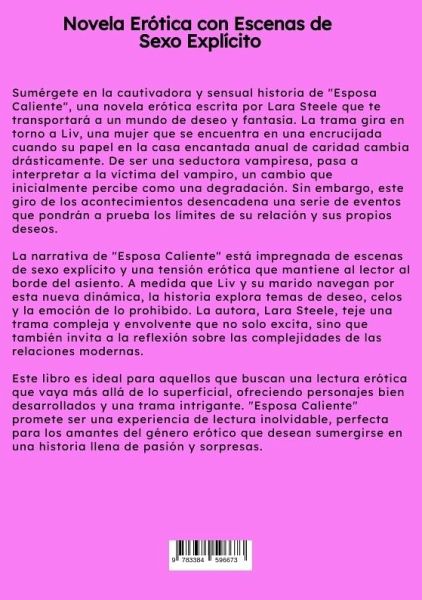 Sumérgete en la cautivadora y sensual historia de "Esposa Caliente", una novela erótica escrita por Lara Steele que te transportará a un mundo de deseo y fantasía. La trama gira en torno a Liv, una mujer que se encuentra en una encrucijada cuando su papel en la casa encantada anual de caridad cambia drásticamente. De ser una seductora vampiresa, pasa a interpretar a la víctima del vampiro, un cambio que inicialmente percibe como una degradación. Sin embargo, este giro de los acontecimientos desencadena una serie de eventos que pondrán a prueba los límites de su relación y sus propios deseos.La narrativa de "Esposa Caliente" está impregnada de escenas de sexo explícito y una tensión erótica que mantiene al lector al borde del asiento. A medida que Liv y su marido navegan por esta nueva dinámica, la historia explora temas de deseo, celos y la emoción de lo prohibido. La autora, Lara Steele, teje una trama compleja y envolvente que no solo excita, sino que también invita a la reflexión sobre las complejidades de las relaciones modernas.Este libro es ideal para aquellos que buscan una lectura erótica que vaya más allá de lo superficial, ofreciendo personajes bien desarrollados y una trama intrigante. "Esposa Caliente" promete ser una experiencia de lectura inolvidable, perfecta para los amantes del género erótico que desean sumergirse en una historia llena de pasión y sorpresas.