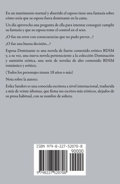 En un matrimonio normal y aburrido el esposo tiene una fantasía sobre cómo sería que su esposa fuera dominante en la cama. Un día aprovecha una pregunta de ella para intentar conseguir cumplir su fantasía y que su esposa tome el control en el sexo. ¿O fue un error con consecuencias que no pudo prever...? ¿O fue una buena decisión...? Esposa Dominante es una novela de fuerte contenido erótico BDSM y, a su vez, una nueva novela perteneciente a la colección Dominación y sumisión erótica, una serie de novelas de alto contenido BDSM romántico y erótico. (Todos los personajes tienen 18 años o más) Nota sobre la autora: Erika Sanders es una conocida escritora a nivel internacional, traducida a más de veinte idiomas, que firma sus escritos más eróticos, alejados de su prosa habitual, con su nombre de soltera.