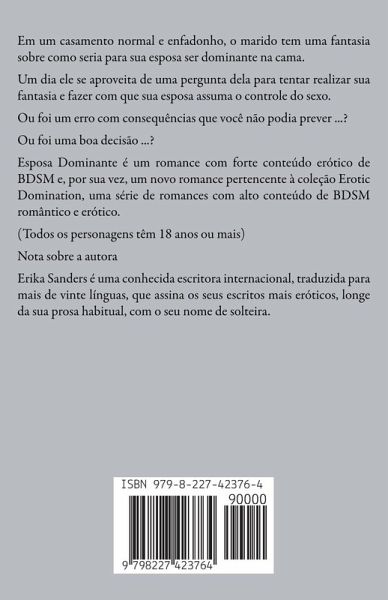Em um casamento normal e enfadonho, o marido tem uma fantasia sobre como seria para sua esposa ser dominante na cama. Um dia ele se aproveita de uma pergunta dela para tentar realizar sua fantasia e fazer com que sua esposa assuma o controle do sexo. Ou foi um erro com consequências que você não podia prever ...? Ou foi uma boa decisão ...? Esposa Dominante é um romance com forte conteúdo erótico de BDSM e, por sua vez, um novo romance pertencente à coleção Erotic Domination, uma série de romances com alto conteúdo de BDSM romântico e erótico. (Todos os personagens têm 18 anos ou mais) Nota sobre a autora Erika Sanders é uma conhecida escritora internacional, traduzida para mais de vinte línguas, que assina os seus escritos mais eróticos, longe da sua prosa habitual, com o seu nome de solteira.