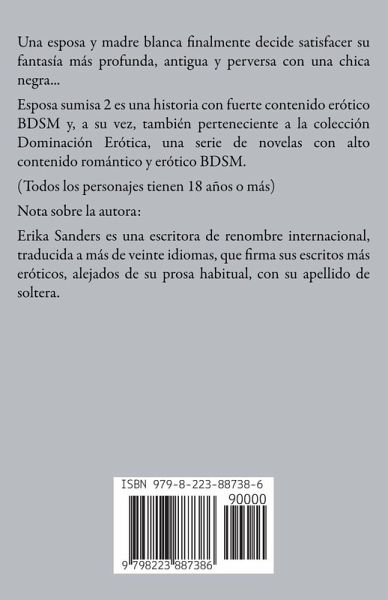Una esposa y madre blanca finalmente decide satisfacer su fantasía más profunda, antigua y perversa con una chica negra... Esposa sumisa 2 es una historia con fuerte contenido erótico BDSM y, a su vez, también perteneciente a la colección Dominación Erótica, una serie de novelas con alto contenido romántico y erótico BDSM. (Todos los personajes tienen 18 años o más) Nota sobre la autora: Erika Sanders es una escritora de renombre internacional, traducida a más de veinte idiomas, que firma sus escritos más eróticos, alejados de su prosa habitual, con su apellido de soltera.