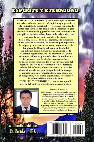 ESPÍRITU Y ETERNIDAD, nos enseña que la muerte no existe, sólo un proceso del espíritu, que pasa de la vida material a la espiritual y viceversa; cumpliendo tantas reencarnaciones como sean necesarias en este proceso de evolución y purificación que se tendrá que cumplir en las inexorables leyes de la existencia, para alcanzar la luz espiritual de vida eterna. Esta obra, trata el tema del espíritu, sus funciones en las leyes de evolución, su elevación por expiación de culpas y sus reencarnaciones, hasta alcanzar la luz plena de Dios. Se tocan temas relacionados a los sufrimientos del espíritu, en estado de oscuridad en las terribles esferas del infierno; además se analizan todas las dimensiones de luz, por las que habrá de trasegar el espíritu para su evolución definitiva, como son el purgatorio, y los cielos espirituales, celestiales y la esfera máxima de luz de Dios. ESPÍRITU Y ETERNIDAD, todo un compendio acerca del espíritu, espiritismo, infierno y cielo.