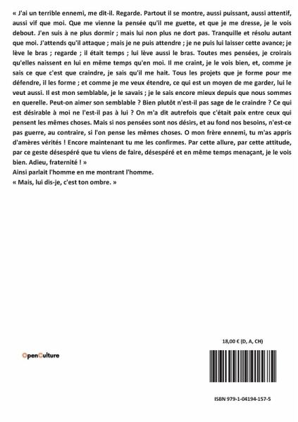 « J'ai un terrible ennemi, me dit-il. Regarde. Partout il se montre, aussi puissant, aussi attentif, aussi vif que moi. Que me vienne la pensée qu'il me guette, et que je me dresse, je le vois debout. J'en suis à ne plus dormir ; mais lui non plus ne dort pas. Tranquille et résolu autant que moi. J'attends qu'il attaque ; mais je ne puis attendre ; je ne puis lui laisser cette avance; je lève le bras ; regarde ; il était temps ; lui lève aussi le bras. Toutes mes pensées, je croirais qu'elles naissent en lui en même temps qu'en moi. Il me craint, je le vois bien, et, comme je sais ce que c'est que craindre, je sais qu'il me hait. Tous les projets que je forme pour me défendre, il les forme ; et comme je me veux étendre, ce qui est un moyen de me garder, lui le veut aussi. Il est mon semblable, je le savais ; je le sais encore mieux depuis que nous sommes en querelle. Peut-on aimer son semblable ? Bien plutôt n'est-il pas sage de le craindre ? Ce qui est désirable à moi ne l'est-il pas à lui ? On m'a dit autrefois que c'était paix entre ceux qui pensent les mêmes choses. Mais si nos pensées sont nos désirs, et au fond nos besoins, n'est-ce pas guerre, au contraire, si l'on pense les mêmes choses. O mon frère ennemi, tu m'as appris d'amères vérités ! Encore maintenant tu me les confirmes. Par cette allure, par cette attitude, par ce geste désespéré que tu viens de faire, désespéré et en même temps menaçant, je le vois bien. Adieu, fraternité ! » Ainsi parlait l'homme en me montrant l'homme. « Mais, lui dis-je, c'est ton ombre. »