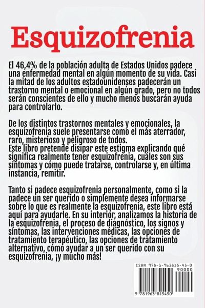 Esquizofrenia La esquizofrenia se presenta a menudo como una de las enfermedades mentales más aterradoras e incomprendidas, envuelta en el estigma, el miedo y la desinformación. Sin embargo, es mucho más común -y más manejable- de lo que mucha gente cree. Casi la mitad de los adultos estadounidenses se enfrentarán a un trastorno mental o emocional en algún momento de su vida, pero pocos comprenderán plenamente lo que están experimentando o se sentirán capacitados para buscar la ayuda que necesitan. Entre estos trastornos destaca la esquizofrenia, a menudo tachada erróneamente de peligrosa, misteriosa e intratable. Este libro pretende cambiar esa narrativa arrojando luz sobre lo que realmente significa vivir con esquizofrenia y cómo puede tratarse y controlarse con éxito. En esta completa guía, descubrirá la realidad de la esquizofrenia: qué es, qué no es y cómo afecta a quienes viven con ella. Lejos de ser una condena a cadena perpetua, la esquizofrenia puede tratarse eficazmente con el enfoque adecuado, lo que permite a las personas llevar una vida plena. El libro profundiza en la historia de la esquizofrenia, proporcionando un contexto sobre cómo han evolucionado las percepciones sociales, a menudo ensombrecidas por el miedo y la incomprensión. Aprenderá sobre el proceso de diagnóstico, explorando cómo los profesionales de la salud mental identifican y diferencian la esquizofrenia de otras enfermedades mentales, disipando mitos y ofreciendo claridad en el camino. El libro ofrece una visión detallada de los signos y síntomas de la esquizofrenia, ayudándole a comprender las experiencias de los afectados. Abarca la amplia gama de intervenciones médicas disponibles, desde los medicamentos antipsicóticos hasta los tratamientos más novedosos y vanguardistas. También descubrirá opciones de tratamiento terapéutico que complementan los enfoques médicos, como la terapia cognitivo-conductual y el apoyo psicosocial, que desempeñan un papel crucial a la hora de ayudar a las personas a controlar sus síntomas y mejorar su calidad de vida. Pero esta guía va más allá de los métodos de tratamiento tradicionales, explorando enfoques alternativos que pueden proporcionar apoyo y alivio adicionales. Desde cambios en el estilo de vida y terapias holísticas hasta nuevas investigaciones sobre dieta y atención plena, encontrará una gran cantidad de información sobre cómo navegar por las complejidades de la esquizofrenia de una manera que se adapte a las necesidades individuales. Para aquellos que apoyan a sus seres queridos, el libro ofrece consejos compasivos sobre cómo ser un pilar de fortaleza, proporcionando consejos prácticos para la comunicación, el establecimiento de límites y el ofrecimiento del tipo adecuado de ayuda. Tanto si está afectado personalmente por la esquizofrenia, como si apoya a alguien que la padece o simplemente quiere informarse, este libro es un recurso inestimable. Su objetivo es sustituir el miedo por la comprensión, el estigma por la empatía y la confusión por el conocimiento. Al final, verá que la esquizofrenia no es una enfermedad desesperada, sino que, con la orientación y el apoyo adecuados, puede controlarse, tratarse e incluso remitir. Deje que este libro sea su guía en el camino hacia la comprensión, la aceptación y la esperanza.