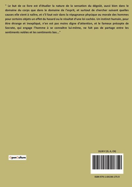 " Le but de ce livre est d¿étudier la nature de la sensation du dégoût, aussi bien dans le domaine du corps que dans le domaine de l¿esprit, et surtout de chercher suivant quelles causes elle vient à naître, et s¿il faut voir dans la répugnance physique ou morale des hommes pour certains objets un effet du hasard ou le résultat d¿une loi cachée. Un instinct humain, pour être étrange et inexpliqué, n¿en est pas moins digne d¿attention, et le fameux précepte de Socrate, qui engage l¿homme à se connaître lui-même, ne fait pas de partage entre les sentiments nobles et les sentiments bas..."
