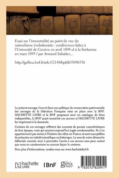 Essai sur l'immortalite au point de vue du naturalisme evolutioniste : conferences faites a l'Universite de Geneve en avril 1894 et a la Sorbonne en mars 1895 / par Armand Sabatier,...Date de l'edition originale : 1895Ce livre est la reproduction fidele d'une oeuvre publiee avant 1920 et fait partie d'une collection de livres reimprimes a la demande editee par Hachette Livre, dans le cadre d'un partenariat avec la Bibliotheque nationale de France, offrant l'opportunite d'acceder a des ouvrages anciens et souvent rares issus des fonds patrimoniaux de la BnF.Les oeuvres faisant partie de cette collection ont ete numerisees par la BnF et sont presentes sur Gallica, sa bibliotheque numerique.En entreprenant de redonner vie a ces ouvrages au travers d'une collection de livres reimprimes a la demande, nous leur donnons la possibilite de rencontrer un public elargi et participons a la transmission de connaissances et de savoirs parfois difficilement accessibles.Nous avons cherche a concilier la reproduction fidele d'un livre ancien a partir de sa version numerisee avec le souci d'un confort de lecture optimal. Nous esperons que les ouvrages de cette nouvelle collection vous apporteront entiere satisfaction.Pour plus d'informations, rendez-vous sur www.hachettebnf.frhttp://gallica.bnf.fr/ark:/12148/bpt6k55096536