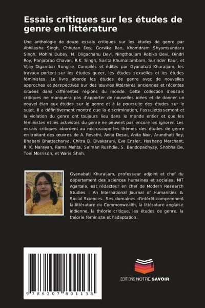 Une anthologie de douze essais critiques sur les études de genre par Abhilasha Singh, Chhutan Dey, Gorvika Rao, Khomdram Shyamsundara Singh, Mohini Dubey, N. Oligachanu Devi, Ningthoujam Rebika Devi, Oindri Roy, Panjabrao Chavan, R.K. Singh, Sarita Khumallambam, Surinder Kaur, et Vijay Digambar Songire. Compilés et édités par Gyanabati Khuraijam, les travaux portent sur les études queer, les études sexuelles et les études féministes. Le livre aborde les études de genre avec de nouvelles approches et perspectives sur des oeuvres littéraires anciennes et récentes situées dans différentes régions du monde. Cette collection d'essais critiques ne manquera pas d'apporter de nouvelles idées et de donner un nouvel élan aux études sur le genre et à la poursuite des études sur le sujet. Il a définitivement montré que la discrimination, l'assujettissement et la violation du genre ont toujours lieu dans le monde entier et que les féministes et les activistes du genre ne peuvent pas encore les ignorer. Les essais critiques abordent au microscope les thèmes des études de genre en traitant des oeuvres de A. Revathi, Anita Desai, Anita Nair, Arundhati Roy, Bhabani Bhattacharya, Chitra B. Divakaruni, Eve Ensler, Hoshang Merchant, R. K. Narayan, Rama Mehta, Salman Rushdie, S. Bandopadhyay, Shobha De, Toni Morrison, et Waris Shah.