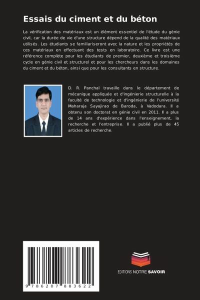 La vérification des matériaux est un élément essentiel de l'étude du génie civil, car la durée de vie d'une structure dépend de la qualité des matériaux utilisés. Les étudiants se familiariseront avec la nature et les propriétés de ces matériaux en effectuant des tests en laboratoire. Ce livre est une référence complète pour les étudiants de premier, deuxième et troisième cycle en génie civil et structurel et pour les chercheurs dans les domaines du ciment et du béton, ainsi que pour les consultants en structure.