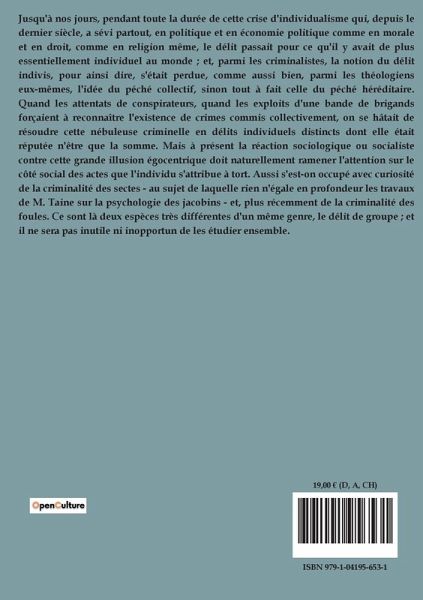 Jusqu'à nos jours, pendant toute la durée de cette crise d'individualisme qui, depuis le dernier siècle, a sévi partout, en politique et en économie politique comme en morale et en droit, comme en religion même, le délit passait pour ce qu'il y avait de plus essentiellement individuel au monde ; et, parmi les criminalistes, la notion du délit indivis, pour ainsi dire, s'était perdue, comme aussi bien, parmi les théologiens eux-mêmes, l'idée du péché collectif, sinon tout à fait celle du péché héréditaire. Quand les attentats de conspirateurs, quand les exploits d'une bande de brigands forçaient à reconnaître l'existence de crimes commis collectivement, on se hâtait de résoudre cette nébuleuse criminelle en délits individuels distincts dont elle était réputée n'être que la somme. Mais à présent la réaction sociologique ou socialiste contre cette grande illusion égocentrique doit naturellement ramener l'attention sur le côté social des actes que l'individu s'attribue à tort. Aussi s'est-on occupé avec curiosité de la criminalité des sectes - au sujet de laquelle rien n'égale en profondeur les travaux de M. Taine sur la psychologie des jacobins - et, plus récemment de la criminalité des foules. Ce sont là deux espèces très différentes d'un même genre, le délit de groupe ; et il ne sera pas inutile ni inopportun de les étudier ensemble.
