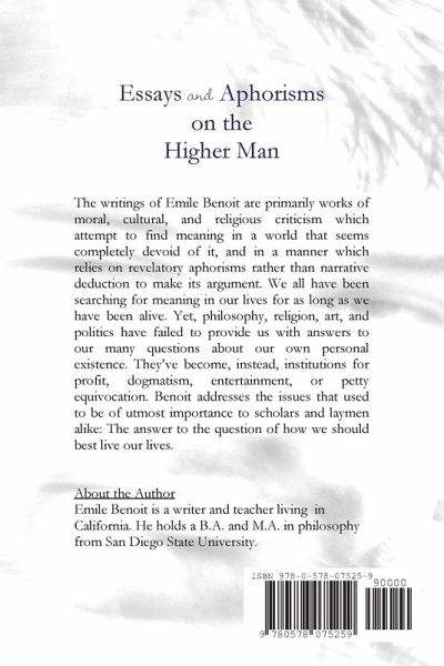 The writings of Emile Benoit are primarily works of moral, cultural, and religious criticism which attempt to find meaning in a world that seems completely devoid of it, and in a manner which relies on revelatory aphorisms rather than narrative deduction to make its argument. We all have been searching for meaning in our lives for as long as we have been alive. Yet, philosophy, religion, art, and politics have failed to provide us with answers to our many questions about our own personal existence. They've become, instead, institutions for profit, dogmatism, entertainment, or petty equivocation. Benoit addresses the issues that used to be of utmost importance to scholars and laymen alike: The answer to the question of how we should best live our lives.
