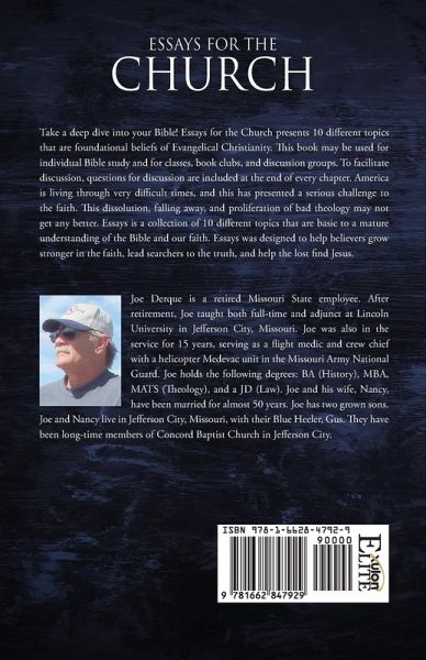 Take a deep dive into your Bible! Essays for the Church presents 10 different topics that are foundational beliefs of Evangelical Christianity. This book may be used for individual Bible study and for classes, book clubs, and discussion groups. To facilitate discussion, questions for discussion are included at the end of every chapter. America is living through very difficult times, and this has presented a serious challenge to the faith. This dissolution, falling away, and proliferation of bad theology may not get any better. Essays is a collection of 10 different topics that are basic to a mature understanding of the Bible and our faith. Essays was designed to help believers grow stronger in the faith, lead searchers to the truth, and help the lost find Jesus. Joe Derque is a retired Missouri State employee. After retirement, Joe taught both full-time and adjunct at Lincoln University in Jefferson City, Missouri. Joe was also in the service for 15 years, serving as a flight medic and crew chief with a helicopter Medevac unit in the Missouri Army National Guard. Joe holds the following degrees: BA (History), MBA, MATS (Theology), and a JD (Law). Joe and his wife, Nancy, have been married for almost 50 years. Joe has two grown sons. Joe and Nancy live in Jefferson City, Missouri, with their Blue Heeler, Gus. They have been long-time members of Concord Baptist Church in Jefferson City.