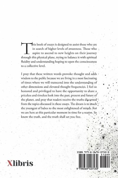 This book of essays is designed to assist those who are in search of higher levels of awareness. Those who aspire to ascend to new heights on their journey through this physical plane, trying to balance it with spiritual fluidity and understanding hoping to open the consciousness to a collective level. I pray that these written words provoke thought and adds wisdom to the public because we are living in a most fascinating of times where we will transcend into the understanding of other dimensions and elevated thought frequencies. I feel so honored and privileged to have the opportunity to share a priceless and timeless look into the past, present and future of the planet, and pray that readers receive the truths discerned from the topics discussed in these essays. The dream is to touch the youngest of babes to the most enlightened of minds. For we are here at this particular moment in time for a reason. So know the truth, and the truth shall set you free.