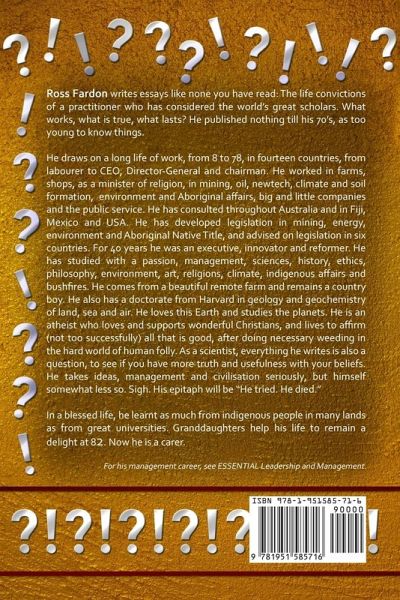 Ross Fardon writes essays like none you have read: The life convictions of a practitioner who has considered the world's great scholars. What works, what is true, what lasts? He published nothing till his 70's, as too young to know things. He draws on a long life of work, from 8 to 78, in fourteen countries, from labourer to CEO, Director-General and chairman. He worked in farms, shops, as a minister of religion, in mining, oil, newtech, climate and soil formation, environment and Aboriginal affairs, big and little companies and the public service. He has consulted throughout Australia and in Fiji, Mexico and USA. He has developed legislation in mining, energy, environment and Aboriginal Native Title, and advised on legislation in six countries. For 40 years he was an executive, innovator and reformer. He has studied with a passion, management, sciences, history, ethics, philosophy, environment, art, religions, climate, indigenous affairs and bushfires. He comes from a beautiful remote farm and remains a country boy. He also has a doctorate from Harvard in geology and geochemistry of land, sea and air. He loves this Earth and studies the planets. He is an atheist who loves and supports wonderful Christians, and lives to affirm (not too successfully) all that is good, after doing necessary weeding in the hard world of human folly. As a scientist, everything he writes is also a question, to see if you have more truth and usefulness with your beliefs. He takes ideas, management and civilisation seriously, but himself somewhat less so. Sigh. His epitaph will be "He tried. He died. " In a blessed life, he learnt as much from indigenous people in many lands as from great universities. Granddaughters help his life to remain a delight at 82. Now he is a carer. For his management career, see ESSENTIAL Leadership and Management.