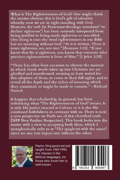 What is The Righteousness of God? One might think the answer obvious: this is God's gift of salvation whereby now we are in right standing with God. However, the verb (in Protestant theology translated "to declare righteous") has been variously interpreted from being justified to being made righteous or sanctified. One thing is true: the word righteousness in our Bible has no meaning without God. "As it is written, There is none righteous, no, not one." [Romans 3:10]. "If you know that He is righteous, you know that everyone who practices righteousness is born of Him." [1 John 2:29]. "There has often been occasion to observe the manner in which Greek words taken up into Christian use are glorified and transformed, seeming to have waited for this adoption of them, to come to their full rights, and to reveal all the depth and the riches of meaning which they contained, or might be made to contain." - Richard Trench It happens that scholarship, in general, has been rethinking what "The Righteousness of God" means. Is it only His justice enacted at Calvary or is it also His continued faithfulness in covenant with us. There is now a new perspective on Paul's use of this cherished truth [NPP New Pauline Perspective]. This book looks into the matter with a view to accepting both ideas, which I metaphorically refer to as "The spaghetti with the sauce" since no one ever enjoys one without the other.