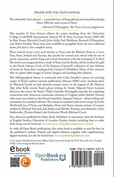 This number of Yeats Annual collects the essays resulting from the University College Cork/ESB International Annual W. B. Yeats Lectures Series (2003-2008) by Roy Foster, Warwick Gould, John Kelly, Paul Muldoon, Bernard O'Donoghue and Helen Vendler. Those that were available in pamphlet form are now collectors' items, but here is the complete series. These revised essays cover such themes as Yeats and the Refrain, Yeats as a Love Poet, Yeats, Ireland and Europe, the puzzles he created and solved with his art of poetic sequences, and his long and crucial interaction with the emerging T. S. Eliot. The series was inaugurated by a study of Yeats and his Books, which marked the gift to the Boole Library, Cork, of Dr Eamonn Cantwell's collection of rare editions of books by Yeats (here catalogued by Crónán Ó Doibhlin). Many of the volume's fifty-six plates offer images of artists' designs and resulting first editions. This bibliographical theme is continued with Colin Smythe's census of surviving copies of Yeats's earliest separate publication, Mosada (1886) and a resultant piece by Warwick Gould on that dramatic poem's source in the legend of the Phantom Ship. John Kelly reveals Yeats's ghost-writing for Sarah Allgood; Geert Lernout discovers the source for Yeats's 'Tulka', Günther Schmigalle unearths his surprising connexions with American communist colonists in Virginia, while Deirdre Toomey edits some new letters to the French anarchist, Auguste Hamon-all providing new annotation for standard editions. The volume is rounded with review essays by Colin McDowell (on A Vision, and Yeats, Hone and Berkeley), shorter reviews of current studies by Michael Edwards, Jad Adams and Deirdre Toomey, and obituaries of Jon Stallworthy (Nicolas Barker) and Katharine Worth (Richard Cave).