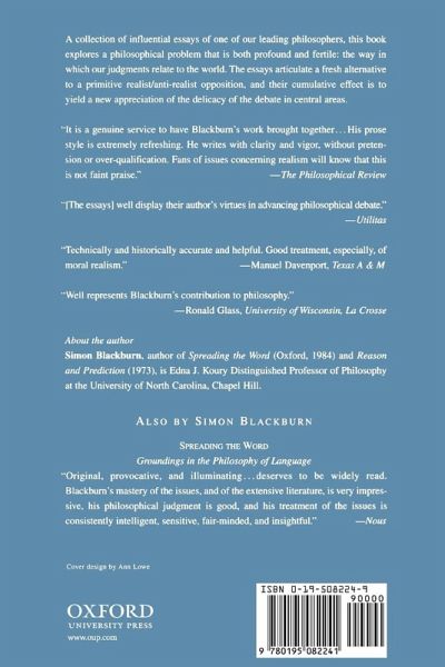 This volume collects together some influential essays in which Simon Blackburn explores one of the most profound and fertile of philosophical problems: the way in which our judgements relate to the world. This debate has centered on realism, or the view that what we say is validated by the way things stand in the world, and a variety of oppositions to it. Prominent among the latter are expressive and projective theories, but also a relaxed pluralism that discourages the view that there are substantial issues at stake. The figure of the `quasi-realist' dramatizes the difficulty of conducting these debates. Typically philosophers thinking of themselves as realists will believe that they alone can give a proper or literal account of some of our attachments - to truth, to facts, to the independent world, to knowledge, and to certainty. The quasi-realist challenge, developed by Blackburn in this volume, is that we can have those attachments without any metaphysic that deserves calling realism, so that the metaphysical picture that goes with our practices is quite idle. The cases treated here include the theory of value, of knowledge, modality, probability, causation, intentionality and rule-following, and explanation. A substantial new introduction has been added, drawing together some of the central themes. The essays articulate a fresh alternative to a primitive realist/anti-realist opposition, and their cumulative effect is to yield a new appreciation of the delicacy of the debate in these central areas.