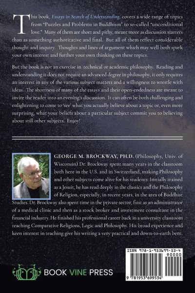 This book, Essays in Search of Understanding, covers a wide range of topics from "Puzzles and Problems in Buddhism" to so-called "unconditional love." Many of them are short and pithy, meant more as discussion starters than as something authoritative and final. But all of them reflect considerable thought and inquiry. Thoughts and lines of argument which may well both spark your own interest and further your own thinking on these topics. But the book is not an exercise in technical or academic philosophy. Reading and understanding it does not require an advanced degree in philosophy, it only…mehr