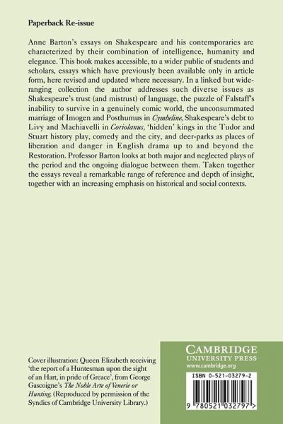 Anne Barton's essays on Shakespeare and his contemporaries are characterized by their combination of intelligence, humanity and elegance. In this linked but wide-ranging collection she addresses such diverse issues as Shakespeare's trust (and mistrust) of language, the puzzle of Falstaff's inability to survive in a genuinely comic world, the unconsummated marriage of Imogen and Posthumus in Cymbeline, Shakespeare's debt to Livy and Machiavelli in Coriolanus, 'hidden' kings in the Tudor and Stuart history play, comedy and the city, and deer-parks as places of liberation and danger in English drama up to and beyond the Restoration. Professor Barton looks at both major and neglected plays of the period and the ongoing dialogue between them. Taken together the essays reveal a remarkable range of reference and depth of insight, together with an increasing emphasis on historical and social contexts.