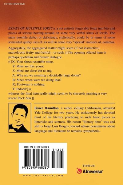 ESSAYS OF MULTIPLE SORTS is a not entirely forgivable foray into bits and pieces of serious horsing-around on some very verbal kinds of levels. The main possible defect or deficiency, stylistically, could be in terms of some somewhat quirky uses of, as well as some very "special" nonuses of, commas. Aggregately, the aggregated matter might seem (if not instructive) marvelously fruity and fruitful-or such. [[The opening offered item is perhaps quotidian and bizarre dialogue (({X: Your shoes resemble mine. Y: Mine are like yours. Z: Mine are close kin to any. A: Why are we awaiting a decidedly large doom? B: Since when were we doing that? X: Footwear is nothing. Y: Indeed!})), whereas the final item really might seem to be sincerely praising a very recent Rock Star.]]