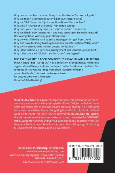 Why can we not learn a damn thing from the likes of Semco, or Toyota? Why are today¿s companies out of balance, structure-wise? Why are "flat hierarchies" just a continuation of the problem? Why are all "change-as-a-journey" metaphors wrong? Why does your company have precisely the culture it deserves? Why are fixed targets overrated - and how can targets be made relevant? Does competition within organizations work? Why do we still find it hard to grasp McGregor's insight from 1960? Why and how does Very Fast Organizational Transformation (VFOT) work? Why do companies need neither bosses, nor leaders? Why is the distinction between management and leadership important? Why is the so-called "digital transformation" over-hyped? This exciting little book combines 20 essays by Niels Pflaeging into a true "Best of Beta." It is a collection of progressive, modernist organizational theory and practice based on the BetaCodex mind-set. The contents of this volume range from short vignettes to highly conceptual texts. This book is a treasure trove for anyone who wants to master the art of Beta thinking! Niels Pflaeging is an advisor for organizational transformation, an entrepreneur, an international keynote speaker. Since 2003, he has helped managers and companies of all kinds master profound change. Niels Pflaeging was a director with the Beyond Budgeting Round Table think tank. He then went on to found the open source community BetaCodex Network. Niels is the author of numerous books, including the best-seller Organize for Complexity and the OpenSpace Beta handbook. Together with Silke Hermann, Niels founded Red42, a startup on the cutting edge of Learning & Development and organizational development.