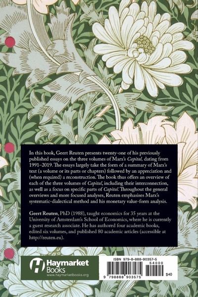 This new collection by Geert Reuten presents 21 of his previously published essays on the three volumes of Marx's Capital, dating from 1991 to 2019. Reuten's perceptive essays foreground Marx's systematic-dialectical method and his monetary value-form analysis. Each essay generally begins with a summary of one of Marx's texts (a Volume or its Parts or Chapters) followed by an appreciation and, if necessary, a reconstruction. The collection gives readers an overview of each of the three volumes - including their interconnection - as well as a more nuanced understanding of the specific parts of Capital.
