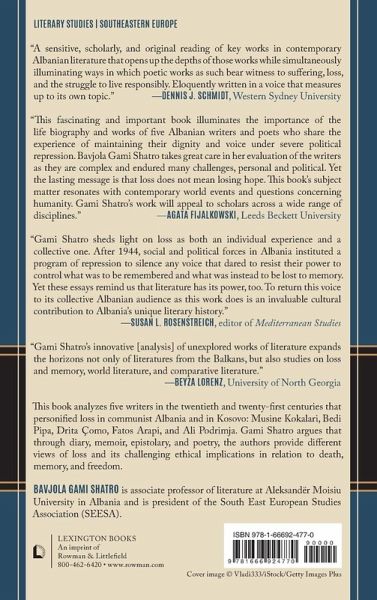 Acknowledgments Introduction Part One: Loss and (Owing to) the Self in Women Authors' (Life) Writing in Contemporary Albanian Literature Chapter One: Musine Kokalari: the (un) silenced voice of a woman writer; Her memoir La mia vita universitaria and her epistolary. Chapter Two: Voicing silence and exploring the self; the Intimate diary by Bedi Pipa Chapter Three: Vowed to loss, voice regained; Light that Comes from the Abyss by Drita Çomo Part Two: Loss in contemporary Albanian Poetry: death, memory and grief Chapter Four: On the threshold of the dark; the impossibility of loss. The poetry of Fatos Arapi Chapter Five: The Awareness of Loss and the Grieving Path of a Poet Father toward the (im)mortal Son; The volume Lum Lumi by Ali Podrimja. Bibliography About the Author