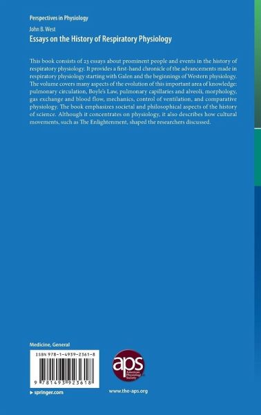 This book consists of 23 essays about prominent people and events in the history of respiratory physiology. It provides a first-hand chronicle of the advancements made in respiratory physiology starting with Galen and the beginnings of Western physiology. The volume covers every aspect of the evolution of this important area of knowledge: pulmonary circulation, Boyle's Law, pulmonary capillaries and alveoli, morphology, gas exchange and blood flow, mechanics, control of ventilation, and comparative physiology. The book emphasizes societal and philosophical aspects of the history of science. Although it concentrates on physiology, it also describes how cultural movements, such as The Enlightenment, shaped the researchers discussed.