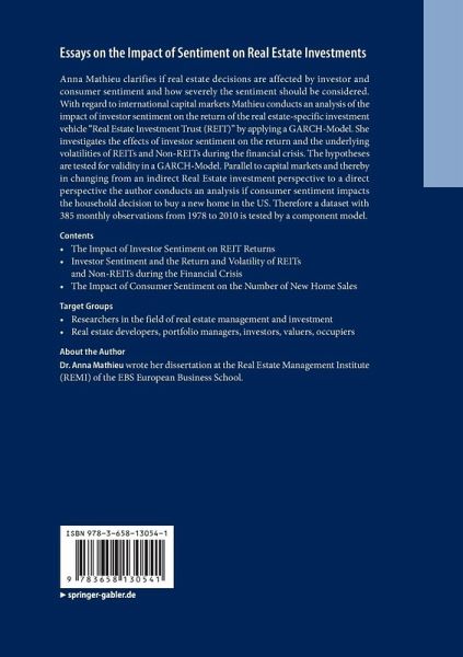 Anna Mathieu clarifies if real estate decisions are affected by investor and consumer sentiment and how severely the sentiment should be considered. With regard to international capital markets Mathieu conducts an analysis of the impact of investor sentiment on the return of the real estate-specific investment vehicle "Real Estate Investment Trust (REIT)" by applying a GARCH-Model. She investigates the effects of investor sentiment on the return and the underlying volatilities of REITs and Non-REITs during the financial crisis. The hypotheses are tested for validity in a GARCH-Model. Parallel to capital markets and thereby in changing from an indirect Real Estate investment perspective to a direct perspective the author conducts an analysis if consumer sentiment impacts the household decision to buy a new home in the US. Therefore a dataset with 385 monthly observations from 1978 to 2010 is tested by a component model.