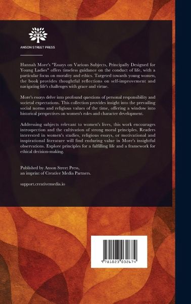 Hannah More's "Essays on Various Subjects, Principally Designed for Young Ladies" offers timeless guidance on the conduct of life, with a particular focus on morality and ethics. Targeted towards young women, the book provides thoughtful reflections on self-improvement and navigating life's challenges with grace and virtue. More's essays delve into profound questions of personal responsibility and societal expectations. This collection provides insight into the prevailing social norms and religious values of the time, offering a window into historical perspectives on women's roles and character development. Addressing subjects relevant to women's lives, this work encourages introspection and the cultivation of strong moral principles. Readers interested in women's studies, religious essays, or motivational and inspirational literature will find enduring value in More's insightful observations. Explore principles for a fulfilling life and a framework for ethical decision-making. This work has been selected by scholars as being culturally important, and is part of the knowledge base of civilization as we know it. This work is in the public domain in the United States of America, and possibly other nations. Within the United States, you may freely copy and distribute this work, as no entity (individual or corporate) has a copyright on the body of the work. Scholars believe, and we concur, that this work is important enough to be preserved, reproduced, and made generally available to the public. We appreciate your support of the preservation process, and thank you for being an important part of keeping this knowledge alive and relevant.