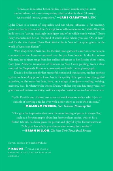 A selection of essays on writing and reading by the master short-fiction writer Lydia Davis Lydia Davis is a writer whose originality, influence, and wit are beyond compare. Jonathan Franzen has called her "a magician of self-consciousness," while Rick Moody hails her as "the best prose stylist in America." And for Claire Messud, "Davis's signal gift is to make us feel alive." Best known for her masterful short stories and translations, Davis's gifts extend equally to her nonfiction. In Essays One, Davis has, for the first time, gathered a selection of essays, commentaries, and lectures composed over the past five decades. In this first of two volumes, her subjects range from her earliest influences to her favorite short stories, from John Ashbery's translation of Rimbaud to Alan Cote's painting, and from the Shepherd's Psalm to early tourist photographs. On display is the development and range of one of the sharpest, most capacious minds writing today.Hinweis: Dieser Artikel kann nur an eine deutsche Lieferadresse ausgeliefert werden.