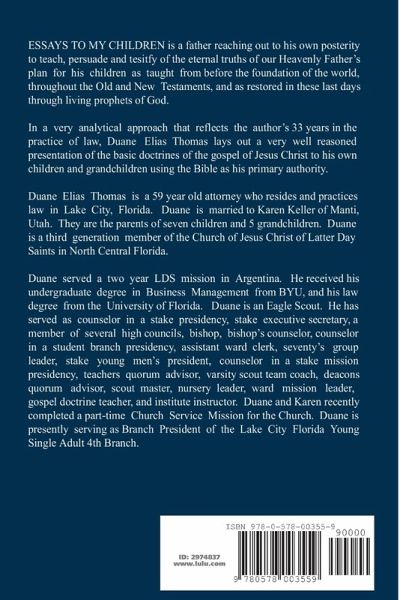 ESSAYS TO MY CHILDREN is a father reaching out to his own posterity to teach, persuade and testify of the eternal truths of our Heavenly Father's plan for his children as taught from before the foundation of the world, throughout the Old and New Testaments, and as restored in these last days through living prophets of God. In a very analytical approach, Duane, a 66 year old practicing attorney from Lake City, Florida, lays out a very well reasoned presentation of the basic doctrines of the gospel of Jesus Christ to his own children using the Bible as his primary authority. Duane served an LDS mission in Argentina. He received his undergraduate degree in Business Management from BYU, and his law degree from the University of Florida. Duane has served as counselor in a stake presidency, stake executive secretary, a member of several high councils, bishop, stake young men's president, ward mission leader, and YSA Branch President.