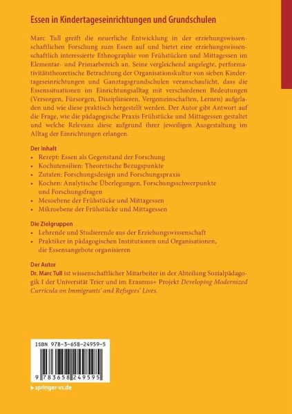 Marc Tull greift die neuerliche Entwicklung in der erziehungswissenschaftlichen Forschung zum Essen auf und bietet eine erziehungswissenschaftlich interessierte Ethnographie von Frühstücken und Mittagessen im Elementar- und Primarbereich an. Seine vergleichend angelegte, performativitätstheoretische Betrachtung der Organisationskultur von sieben Kindertageseinrichtungen und Ganztagsgrundschulen veranschaulicht, dass die Essenssituationen im Einrichtungsalltag mit verschiedenen Bedeutungen (Versorgen, Fürsorgen, Disziplinieren, Vergemeinschaften, Lernen) aufgeladen und wie diese praktisch hergestellt werden. Der Autor gibt Antwort auf die Frage, wie die pädagogische Praxis Frühstücke und Mittagessen gestaltet und welche Relevanz diese aufgrund ihrer jeweiligen Ausgestaltung im Alltag der Einrichtungen erlangen.