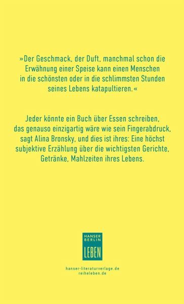 Wenn Bestsellerautorin Alina Bronsky über Essen schreibt, geht es ans Eingemachte: Um Liebe, Hass, Verführung und Erpressung. Nur wenige Dinge sind so privat und so öffentlich, so zelebriert oder verheimlicht, so omnipräsent und zugleich verdrängt wie die Speisen, die wir zu uns nehmen. Jeder könnte ein Buch über Essen schreiben, das genauso einzigartig wäre wie sein Fingerabdruck, behauptet Alina Bronsky, und schreibt nun ihres: Eine höchst subjektive Erzählung über ihre persönliche Beziehung zu Porridge, Schokolade, Butterbrot, Borschtsch oder der Vogelmilchtorte. Denn für sie sind diese Speisen nicht einfach nur Nahrung, sondern ein Mittel der Fürsorge, Emanzipation, emotionalen Erpressung, das mal nach Heimat schmeckt, mal nach Liebe, Hemmungslosigkeit oder Askese. Ein bittersüßes kulinarisches Lesevergnügen: manchmal komisch und manchmal melancholisch.