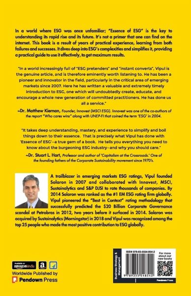 "Do you want to master ESG? This book is a great place to start.ESG stands as one of the most powerful forces influencing businesses today and in the coming decades. While it's easy to grasp the language of ESG, understanding its true essence requires a deeper dive. Only then can we uncover its genuine value.This book offers a perspective on ESG that has been acquired through hands-on experience, involving the assessment of thousands of companies across various sectors and countries worldwide. It reflects insights gained from working with industry frontrunners, pioneers, and leaders who have actively shaped the landscape in the investor, government, regulatory, and corporate worlds over a dynamic career spanning 25+ years."Essence of ESG" is not a primer that one can find on the internet. Instead, it delves deep into ESG's complexities, simplifying them and providing a practical guide for effective use and maximum results.The book covers the history of ESG, the reasons behind its development, and its fundamental relevance, illustrating what it can do for you in the future. Knowing the past, present, and future of ESG is key to creating value for ourselves, our organizations, and the planet.Without this understanding, there's a risk of treating ESG as just another trend or simply arequirement from regulators, investors, or clients. If we don't get it fully, we won't see its true value, limiting what we can gain from it.""A trailblazer in emerging markets ESG ratings, Vipul founded Solaron in 2007 and collaborated with Innovest, MSCI, Sustainalytics and S&P DJSI to rate thousands of companies. By 2014 Solaron was ranked as the #1 EM ESG rating firm globally. Vipul pioneered the "Best in Context" rating methodology that successfully predicted the $20 Billion Corporate Governance scandal at Petrobras in 2012, two years before it surfaced in 2014. Solaron was acquired by Sustainalytics (Morningstar) in 2018 and Vipul was recognized among the top 25 people who made the most positive contribution to ESG globally. "