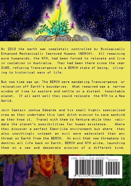 By 2213 the earth was completely controlled by Biologically Enhanced Mechanically Improved Humans (BEMIH). All remaining pure humanoids, the NTH, had been forced to Transvergence or relocation off Earth's boundaries. The NTH must explore and settle on a distant hospitable planet. Join Captain Joshua Edwards and his small highly specialized crew as they undertake this last ditch mission to save mankind as they know it. Travel with them to Ventura while they validate the planet's possibilities for human existence. Where they discover a perfect Eden-like environment but where they also unwittingly unleash an evil more malevolent than any threat on Earth from the BEMIH. An evil that now threatens to destroy all life back on Earth, BEMIH and NTH alike, launching them on a new and desperate mission of a different kind.