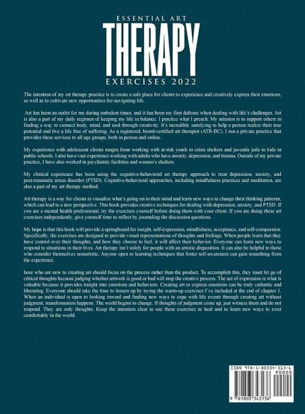 The intention of my art therapy practice is to create a safe place for clients to experience and creatively express their emotions, as well as to cultivate new opportunities for navigating life. Art has been an outlet for me during turbulent times, and it has been my first defense when dealing with life's challenges. Art is also a part of my daily regimen of keeping my life in balance. I practice what I preach. My mission is to support others in finding a way to connect body, mind, and soul through creativity. It's incredibly satisfying to help a person realize their true potential and live a life free of suffering. As a registered, board-certified art therapist (ATR-BC), I run a private practice that provides these services to all age groups, both in person and online. My experience with adolescent clients ranges from working with at-risk youth in crisis shelters and juvenile jails to kids in public schools. I also have vast experience working with adults who have anxiety, depression, and trauma. Outside of my private practice, I have also worked in psychiatric facilities and women's shelters. My clinical experience has been using the cognitive-behavioral art therapy approach to treat depression, anxiety, and post-traumatic stress disorder (PTSD). Cognitive-behavioral approaches, including mindfulness practices and meditation, are also a part of my art therapy method.Art therapy is a way for clients to visualize what's going on in their mind and learn new ways to change their thinking patterns, which can lead to a new perspective. This book provides creative techniques for dealing with depression, anxiety, and PTSD. If you are a mental health professional, try the exercises yourself before doing them with your client. If you are doing these art exercises independently, give yourself time to reflect by journaling the discussion questions. My hope is that this book will provide a springboard for insight, self-expression, mindfulness, acceptance, and self-compassion. Specifically, the exercises are designed to provide visual representations of thoughts and feelings. When people learn that they have control over their thoughts, and how they choose to feel, it will affect their behavior. Everyone can learn new ways to respond to situations in their lives. Art therapy isn't solely for people with an artistic disposition. It can also be helpful to those who consider themselves nonartistic. Anyone open to learning techniques that foster self-awareness can gain something from the experience.hose who are new to creating art should focus on the process rather than the product. To accomplish this, they must let go of critical thoughts because judging whether artwork is good or bad will stop the creative process. The act of expression is what is valuable because it provides insight into emotions and behaviors. Creating art to express emotions can be truly cathartic and liberating. Everyone should take the time to loosen up by trying the warm-up exercises I've included at the end of chapter 1. When an individual is open to looking inward and finding new ways to cope with life events through creating art without judgment, transformation happens. The world begins to change. If thoughts of judgment come up, just witness them and do not respond. They are only thoughts. Keep the intention clear to use these exercises to heal and to learn new ways to exist comfortably in the world.