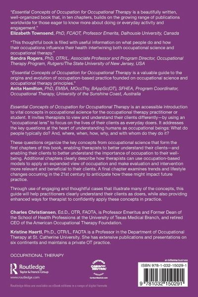 Essential Concepts of Occupation for Occupational Therapy is an accessible introduction to vital concepts in occupational science for the occupational therapy practitioner or student. It invites therapists to view and understand their clients differently-by using an "occupational lens" to focus on the lives of their clients as everyday doers. It addresses the key questions at the heart of understanding humans as occupational beings: What do people typically do? And, where, when, how, why, and with whom do they do it?