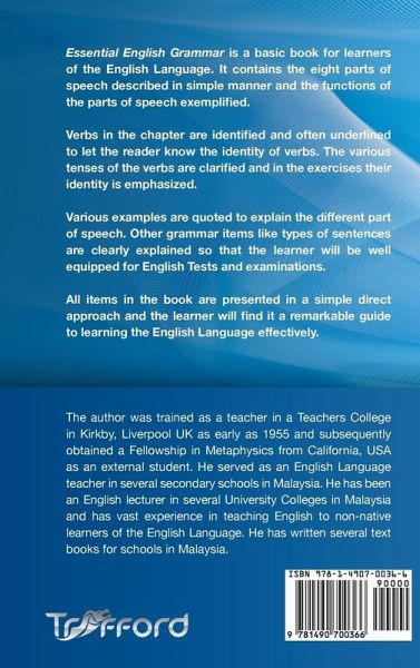 Essential English Grammar is a basic book for learners of the English Language. It contains the eight parts of speech described in simple manner and the functions of the parts of speech exemplified. Verbs in the chapter are identified and often underlined to let the reader know the identity of verbs. The various tenses of the verbs are clarified and in the exercises their identity is emphasized. Various examples are quoted to explain the different part of speech. Other grammar items like types of sentences are clearly explained so that the learner will be well equipped for English Tests and examinations. All items in the book are presented in a simple direct approach and the learner will find it a remarkable guide to learning the English Language effectively.