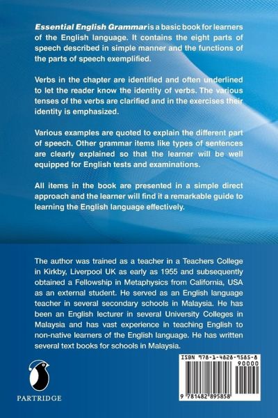 Essential English Grammar is a basic book for learners of the English language. It contains the eight parts of speech described in simple manner and the functions of the parts of speech exemplified. Verbs in the chapter are identified and often underlined to let the reader know the identity of verbs. The various tenses of the verbs are clarified and in the exercises their identity is emphasized. Various examples are quoted to explain the different part of speech. Other grammar items like types of sentences are clearly explained so that the learner will be well equipped for English tests and examinations. All items in the book are presented in a simple direct approach and the learner will find it a remarkable guide to learning the English language effectively.